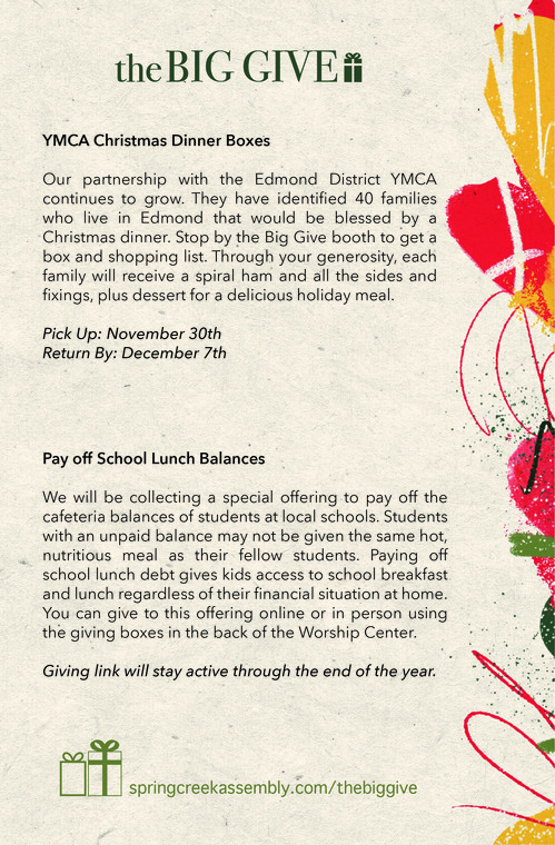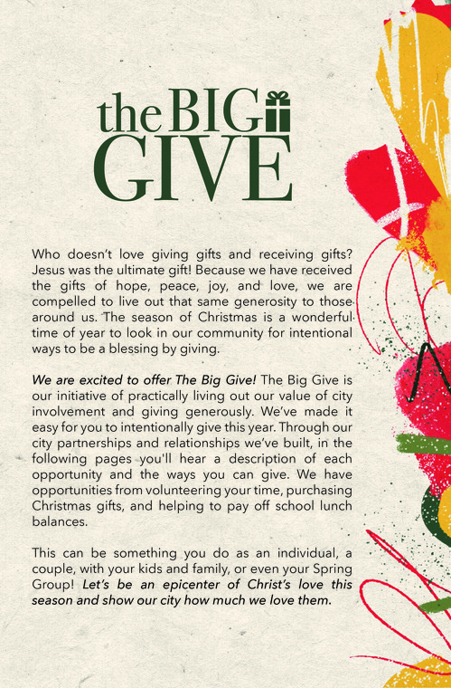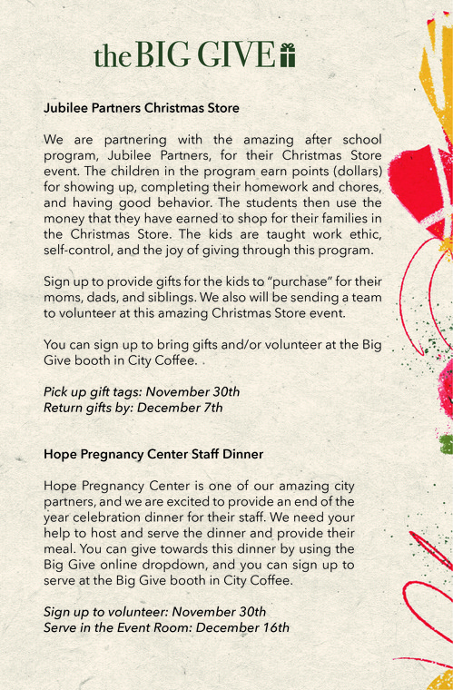 You can find information about all of the various opportunities below. We can accomplish so much more together. Everyone can do something. Visit The Big Give booth in the coffee shop on Sunday, November 30th to let us know how you would like to participate.