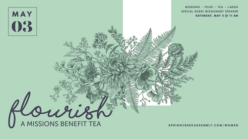 Ladies, you are invited to our annual missions benefit tea on Saturday, May 3rd @ 11 am. You will enjoy a delightful time of fellowship, food, and hear from our special guest, Sarah, a church planter to unreached people groups. Spots are limited so reserve your seat today! We look forward to seeing you at this special event!